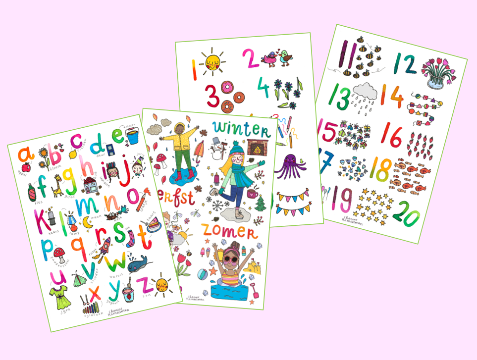 Deze set bevat de 4 posters voor de onderbouw: cijfers 1-10, cijfers 11-20, het alfabet en de seizoenen.
