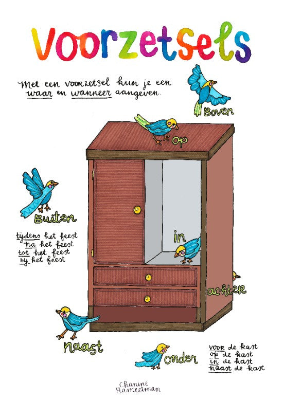 Een duidelijke poster over voorzetsels. Met visuele ondersteuning.