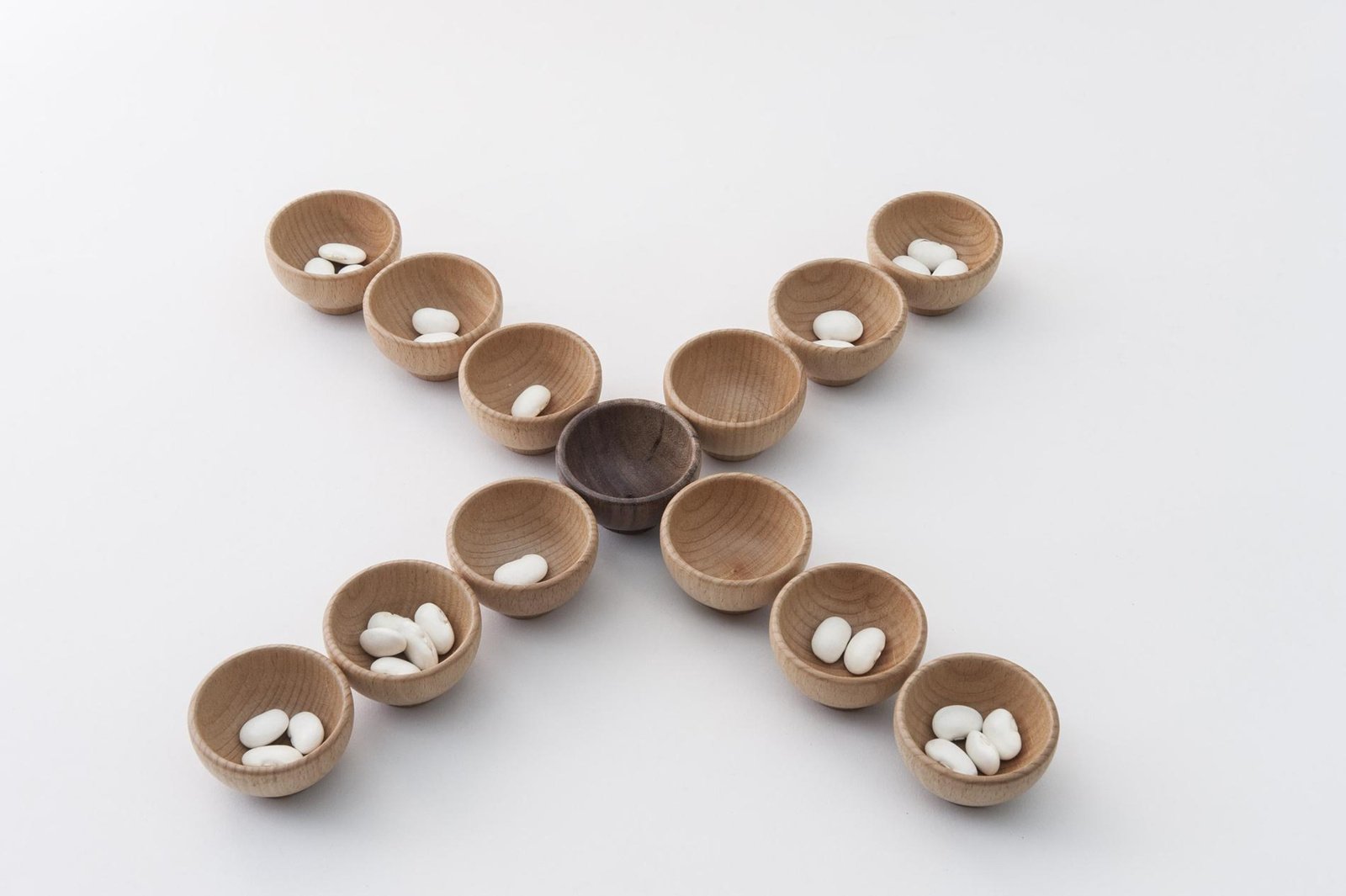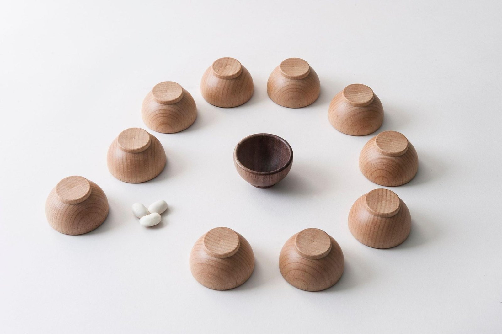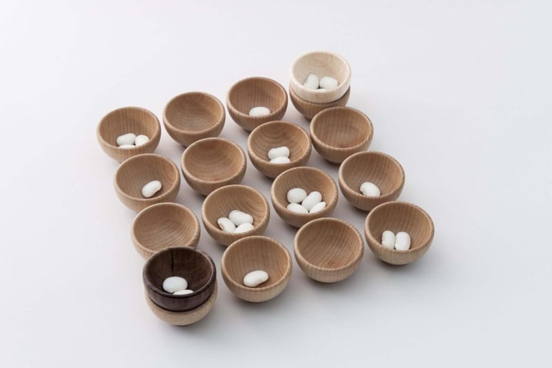 - Inhoud: 18 houten kommen, ongeveer 90 bonen & 1 bonendoos