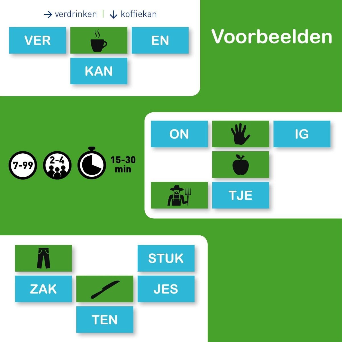 Er zijn kaartjes met afbeeldingen, met woorden en met woorddelen. En er zijn blanco kaartjes die heel divers ingezet kunnen worden. De verschillende kaartjes worden gecombineerd, zodat ze een woord vormen. Na het eerste uitleggen, mag er bij andere woorden aangelegd worden. De speelwijze kan heel goed worden vergeleken met Rummikub en Scrabble.