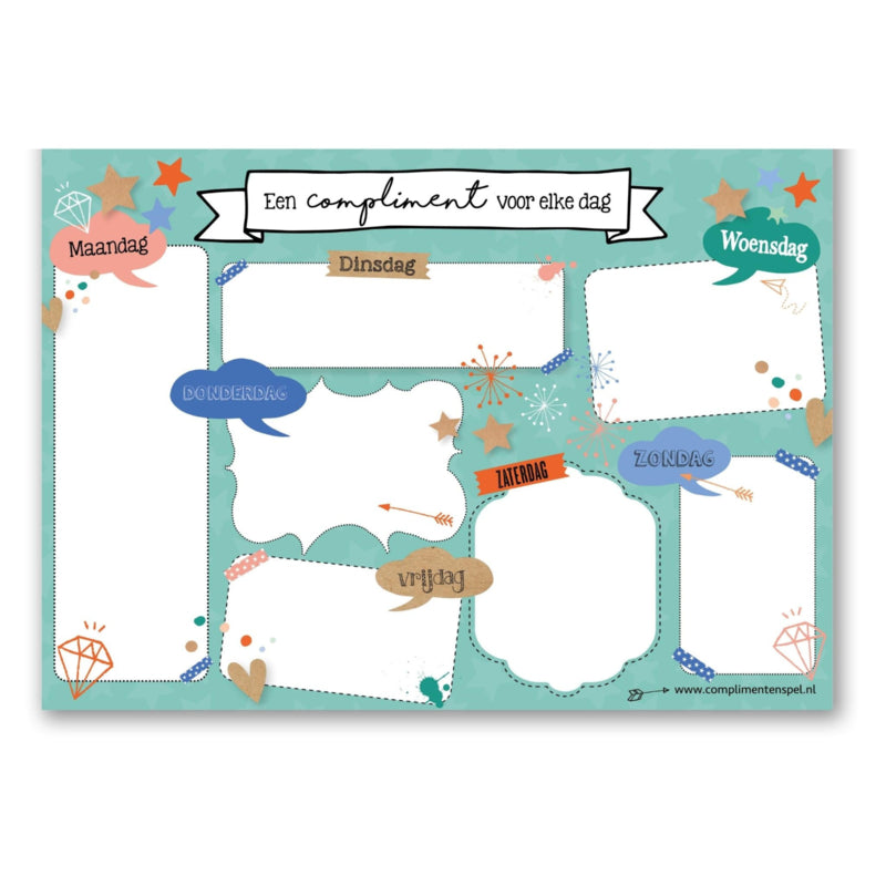 Dit invulblok (50 pagina's, A4 formaat) is fantastisch om elke dag in te vullen. Er is ruimte om dagelijks een compliment op te schrijven.