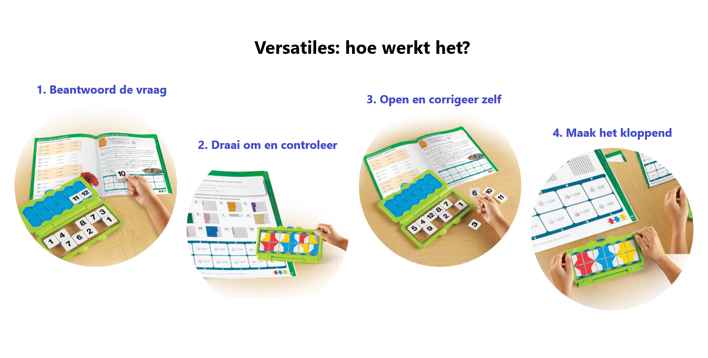 Kinderen leren door de duidelijke opdrachten in het activiteitenboek uit te voeren. Kinderen plaatsen vervolgens de tegels met de nummerzijde naar boven in het antwoorddoosje om de vragen te beantwoorden. Zodra de activiteit is voltooid, sluit u de doos, draait u hem om en controleert u het patroon dat door de doorzichtige basis zichtbaar is, ten opzichte van het patroon op de pagina. Een match betekent dat de antwoorden correct zijn. Als het patroon niet overeenkomt, kunnen kinderen het openen en zichzelf corrigeren. Zie afbeeldingen