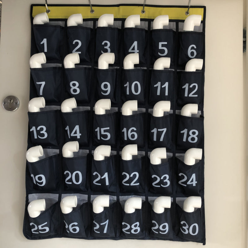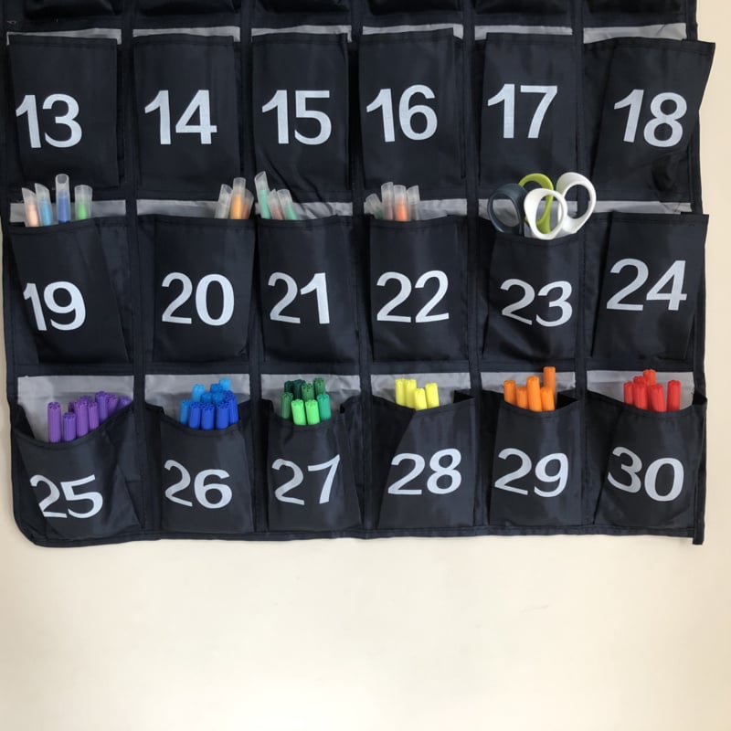 De tas heeft 30 vakjes met een eigen nummer, zodat ieder kind zijn/haar eigen nummer heeft. Er passen telefoons in, stiften, potloden, FluisterTelefoons, scharen, fietssleutels, enz. Multifunctioneel dus! Daarnaast heeft de tas een afmeting van circa 80 x 60 cm.