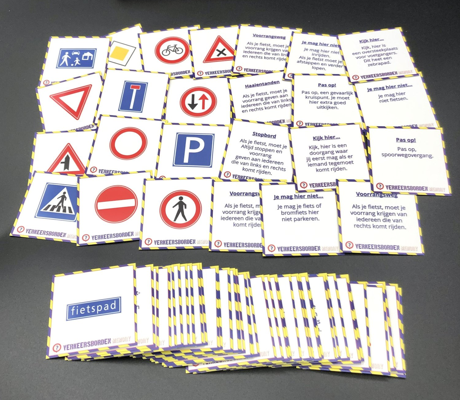 - 72 kaartjes: 36 sets (36 verkeersborden + 36x de betekenis)